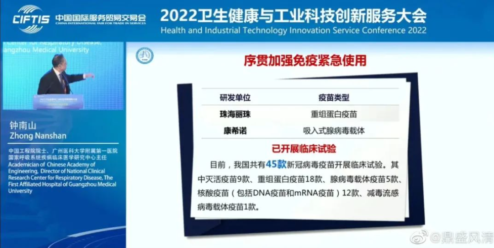 有意思的是,这则消息是正在进行中的服贸会(中国国际服务贸易交易会)的“2022卫生健康与工业科技创新服务大会”(工信部、卫健委、北京市政府主办)上,由钟南山院士宣布的。