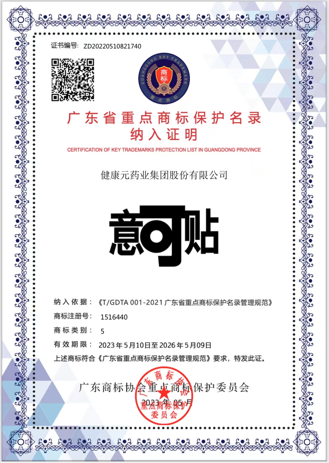 2023年5月10日,广东省商标协会公布了《2022年度广东省重点商标保护名录纳入名单》,经广东商标协会重点商标保护委员会审议通过,ag尊龙凯时·人生就是博药业集团的“意可贴”商标在专家评审的多项商标申报中脱颖而出,与“TCL、ZTE中兴、广发证券”等506件知名商标共同被纳入广东省重点商标保护名录,自2023年5月10日起获得三年有效期。