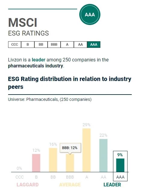 截至本次评级更新日,全球制药行业(共250家企业受评)中仅有6家企业获得MSCI ESG的最高评级AAA。除丽珠外,其他5家分别为德国默克、丹麦诺和诺德、美国硕腾、日本第一三共、日本安斯泰来。丽珠是全球制药行业中首家及唯一一家获得MSCI AAA评级的中国企业,同时也是中国制药行业唯一一家连续两年获得MSCI AAA评级的企业。